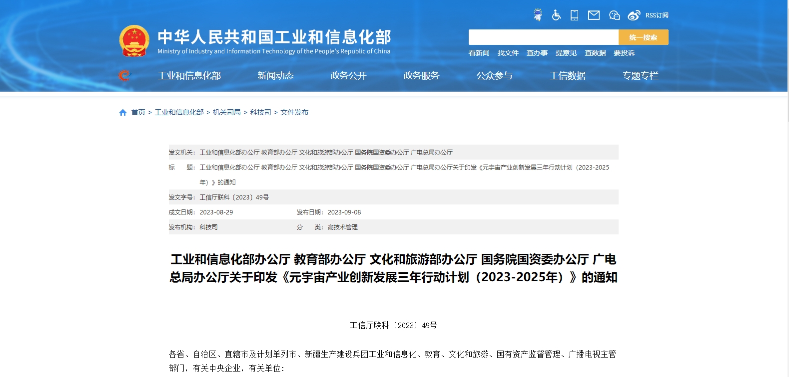 9月8日,工業(yè)和信息化部辦公廳、教育部辦公廳、文化和旅游部辦公廳、國務(wù)院國資委辦公廳、廣電總局辦公廳印發(fā)《元宇宙產(chǎn)業(yè)創(chuàng)新發(fā)展三年行動(dòng)計(jì)劃(2023-2025年)》。