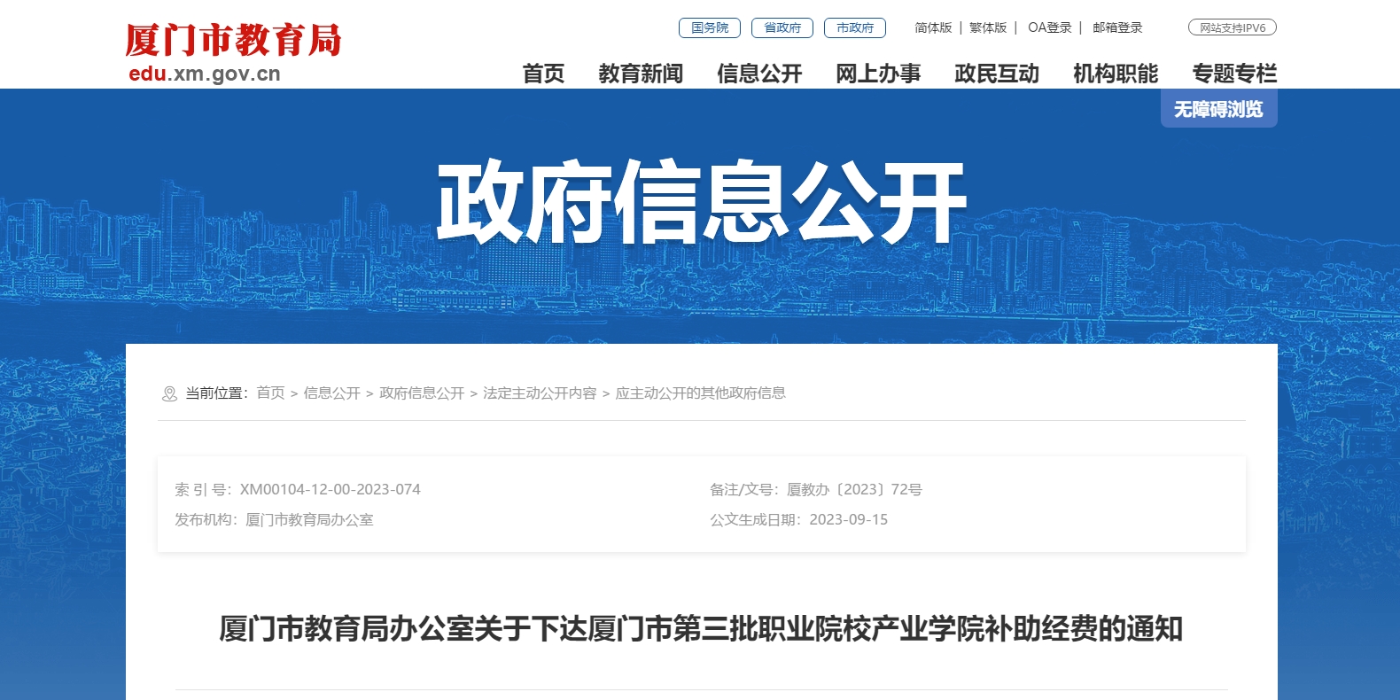 近日,廈門市教育局發(fā)布《廈門市教育局辦公室關(guān)于下達(dá)廈門市第三批職業(yè)院校產(chǎn)業(yè)學(xué)院補(bǔ)助經(jīng)費(fèi)的通知》,本次下達(dá)的補(bǔ)助資金為每個(gè)立項(xiàng)產(chǎn)業(yè)學(xué)院50萬元。本次下達(dá)的廈門市第三批職業(yè)院校產(chǎn)業(yè)學(xué)院補(bǔ)助經(jīng)費(fèi),應(yīng)用于產(chǎn)業(yè)學(xué)院項(xiàng)目建設(shè)和日常運(yùn)營,包括專業(yè)建設(shè)及課程建設(shè)、實(shí)驗(yàn)室及實(shí)習(xí)實(shí)訓(xùn)基地建設(shè)、教師能力提升、校企聯(lián)合開展科研課題等項(xiàng)目。